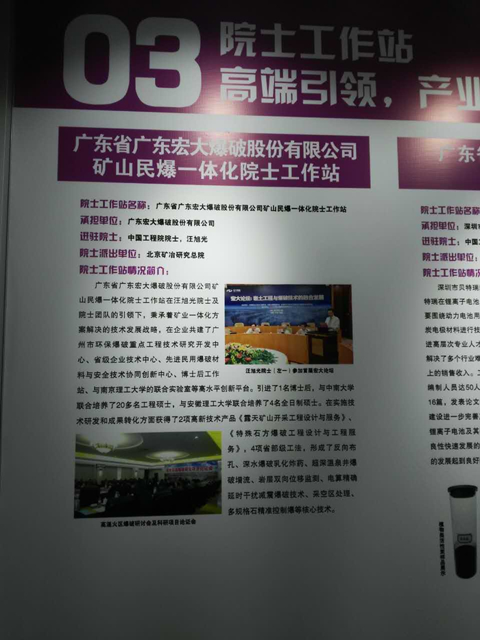 星空在线官网(中国)爆破“矿山民爆一体化院士工作站”,于2014年经广东省科技厅批准立项并资助100万元。目前,广东省共资助建设院士工作站121家,主要涉及先进制造、高端装备、新材料、电子信息、生物医药等领域。本次会展,省科技厅从121家院士工作站中选拔出10家参展,大多数属于新兴行业,星空在线官网(中国)爆破院士工作站是唯一一家传统行业企业,显得弥足珍贵。